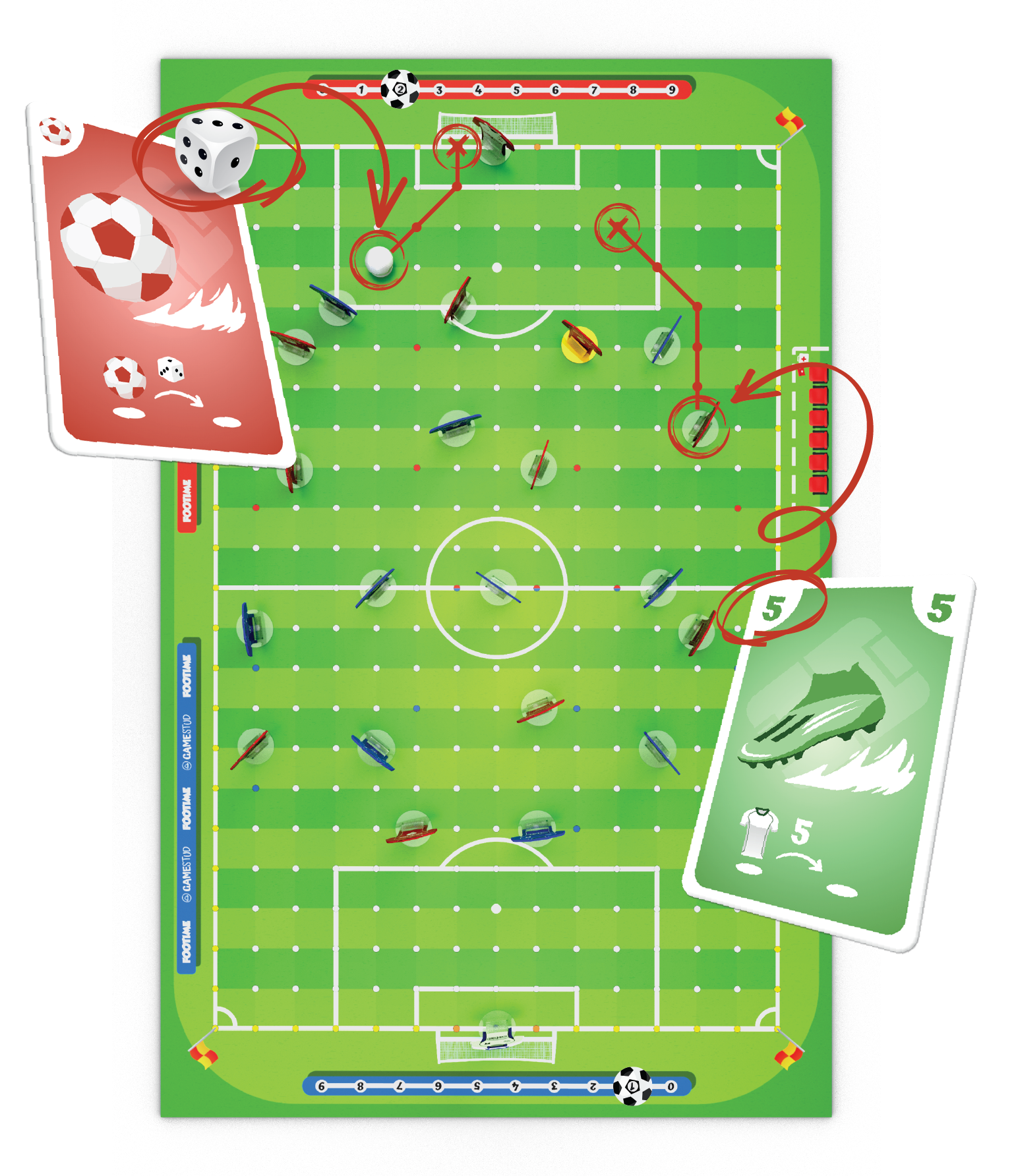Les cartes Passe ou tir (rouges) vont te permettre de faire un coup supplémentaire en déplaçant le ballon s’il est en possession d’un footballeur de ton équipe !